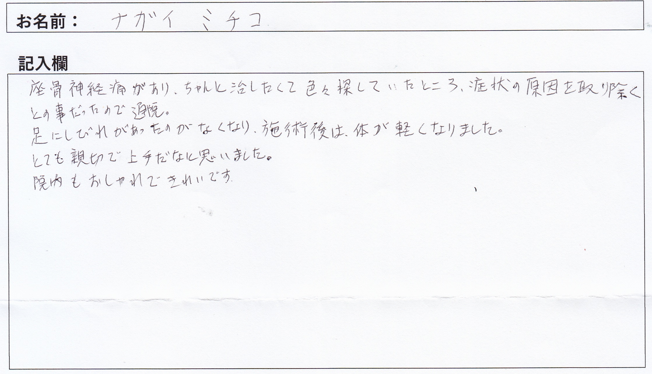 坐骨神経痛があり、ちゃんと治したくて色々探していたところ、症状の原因を取り除くとの事だったので通院。 足のしびれがあったのがなくなり、施術後は体が軽くなりました。 とても親切で上手だなと思いました。 院内もおしゃれできれいです。